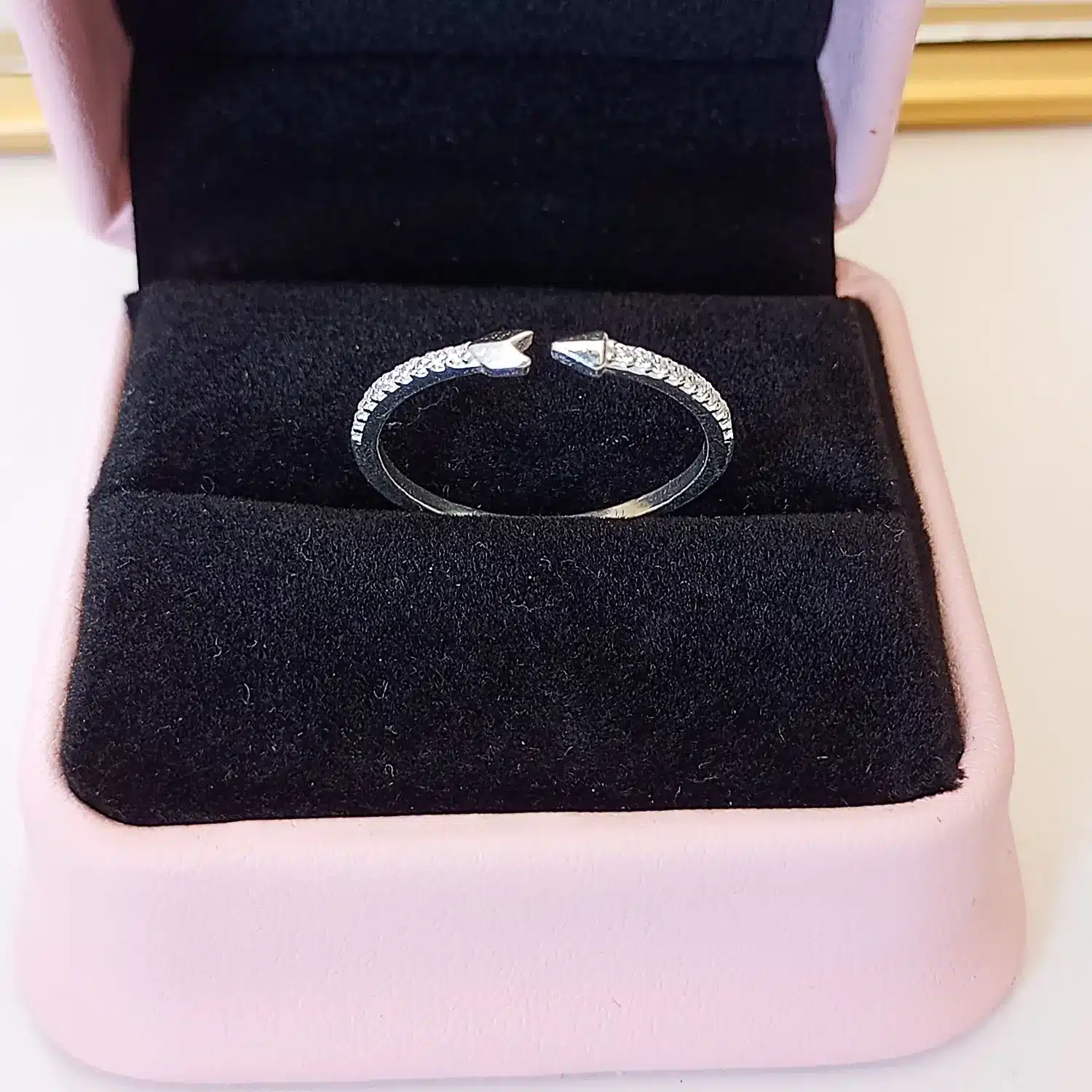 A parte regulável do anel proporciona conforto e ajuste perfeito para qualquer tamanho de dedo, oferecendo praticidade sem perder o charme. A seta cravejada simboliza direção e força, tornando o anel uma peça cheia de significado, além de beleza.
