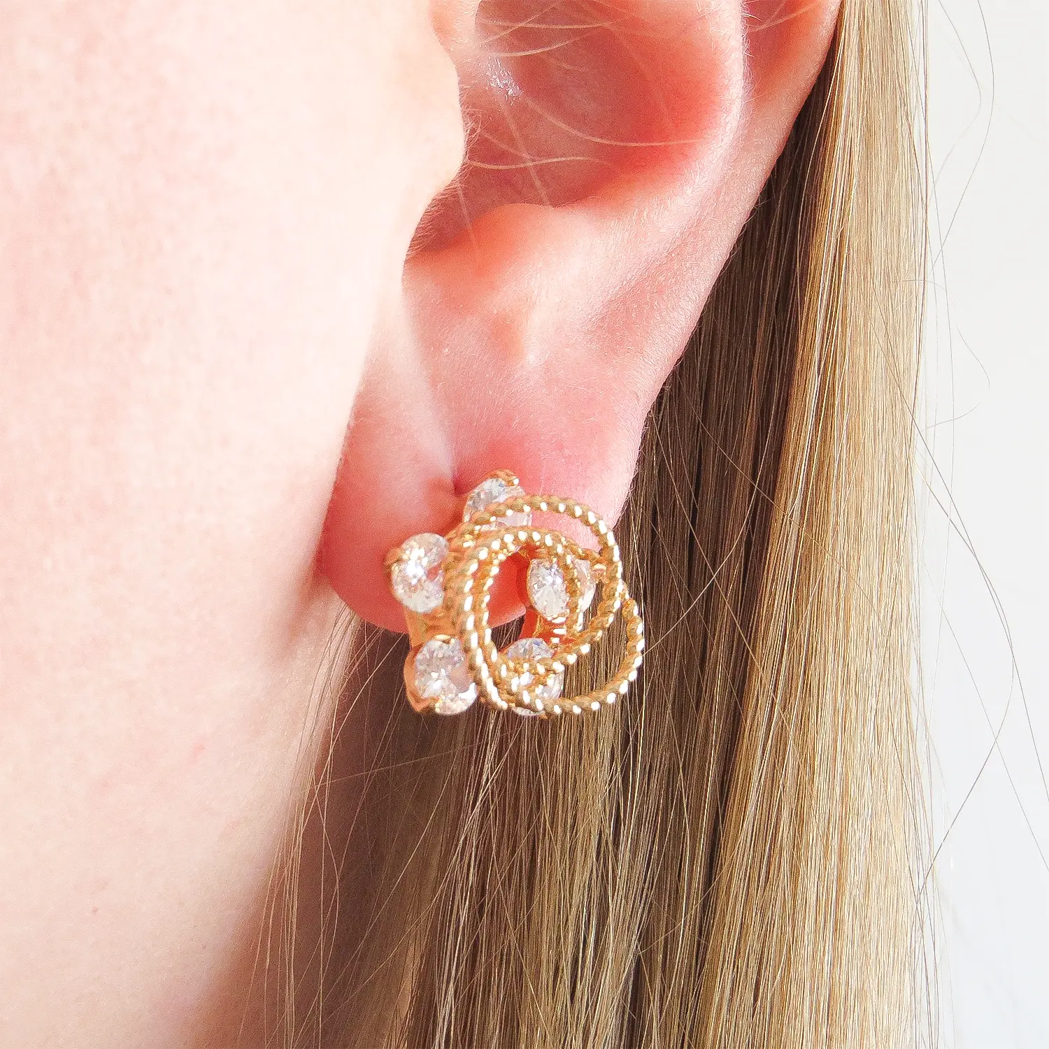 Adicione um toque de brilho e sofisticação ao seu visual com o Brinco Entrelaçado com Zircônias! ✨